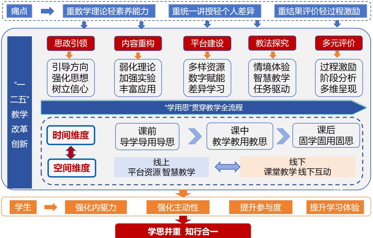 在高等数学课程持续建设过程中,为了“激发学生参与热情,重塑学生学习体验,实现知行合一”,团队提出了“ 一贯穿、二结合、五抓手”的“ 一二五”教学创新模式,实现将“学数学、用数学、思数学”贯穿于整个教学过程,采取课前、课中、课后相结合、线上线下相结合的方式开展教学,聚焦于课程思政,教学内容、教学平台、教学方法、和课程评价五个方面。