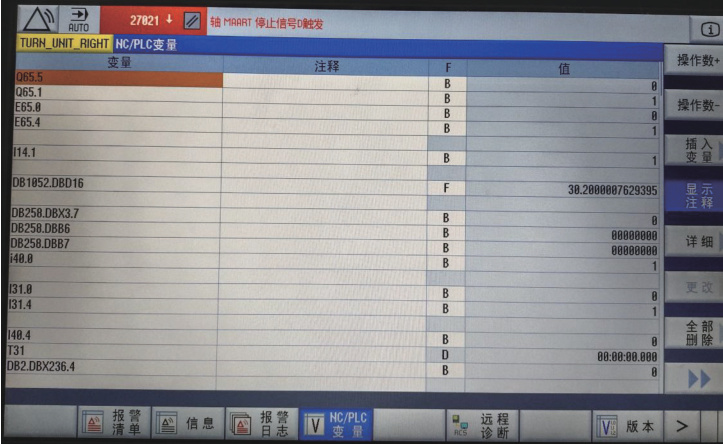 最后通过更换新的编码器读数头,试机故障解除,试机时一定要注意铣削主轴的液力耦合器位置是否正确,在 PLC 监控界面输入 E65.0、E65.4 两个信号点,观察液力耦合器结合和松开接近开关的状态,如果正常则角度不需要调整,如果不对,则需在轴参数 34090 里来进行调整。主轴角度调整时需将主轴定位在 0∘ 位置,将轴锁紧后,结合液力耦合器,(角度相差 0.5∘ 以上液力耦合器就不能结合)结合进去后,松开轴锁紧,在将液力耦合器松开,通过观察加工界面主轴的现在角度值,可以直接判断主轴定位角度是否与耦合角度重合,控制角度偏差在 0.01-0.03 ㎜以内为合格,超过此值,则将其输入轴参数 34090 即可。然后在将主轴定位至 0∘ ,在结合和松开液力耦合器,重复以上动作,直至液力耦合器能正常的结合和松开。[2]