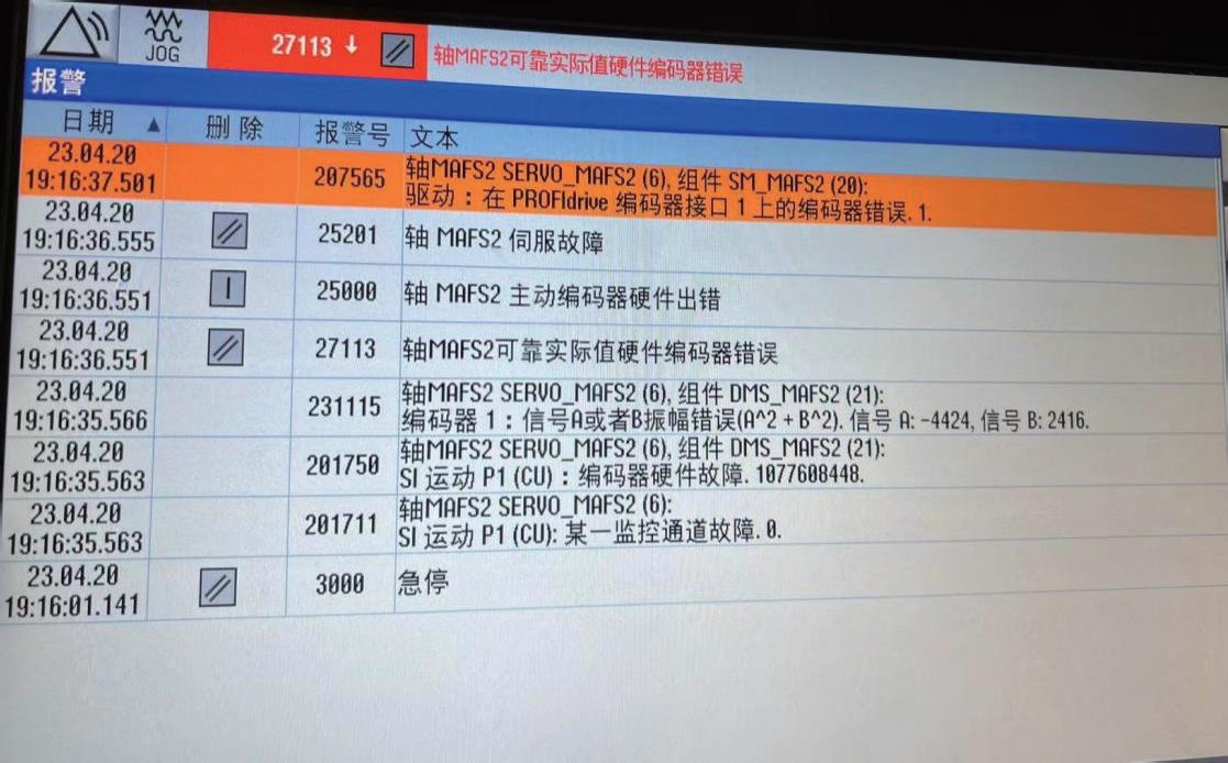 RQMC 双滑枕数控立式车铣中心铣削主轴在加工过程中突然出现 25000 轴 MAFS2 主动编码器硬件出错,同时出现 231115 编码器 1 :信号 A 或者 B 振幅错误报警(信号 A :-4424、信号 B :2416), 断电重启后 , 铣削主轴回零又出现轴 MAFS2 轮廓监控报警,通过手动旋转铣削主轴后,重启试车故障依旧。