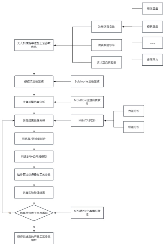 本文研究是讨论先通过实体模型大小对无人机螺旋桨使用 Solidworks 进行三维建模,并将三维模型导入到 Moldflow 中进行仿真分析,记录仿真数据结果;通过仿真得到的数据使用 MINITAB 软件进行方差和极差分析得到注塑参数对于翘曲量的显著性影响排序。最后,通过 BP 神经网络算法进行训练,从而获得工艺参数对于塑件最大翘曲量之间的关系,从而找出最优参数来降低最大翘曲量。具体的技术路线图,如下图2-1。