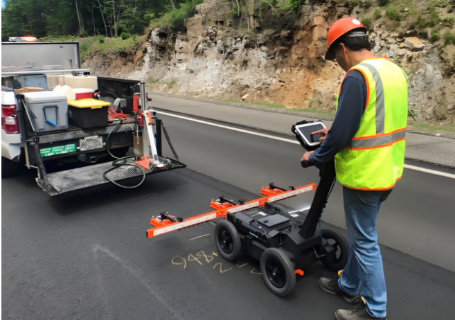 公路工程试验检测是保障工程质量安全与耐久性核心环节,贯穿项目从规划施工到运营维护的全生命周期,规划设计阶段要对沥青水泥骨料等原材料物理力学性能检测,确保材料符合技术标准为结构设计提供可靠参数,避免因材料缺陷引发后期病害情况。施工过程中要对压实度弯沉值平整度等关键指标实时检测,及时发现施工偏差并指导工艺调整优化(图1),比如用核子密度仪检测路基压实度预防不均匀沉降,利用落锤式弯沉仪评估路面承载能力控制结构性破坏风险。工程验收阶段全面的质量检测数据是评价工程合格与否客观依据,像沥青混合料马歇尔试验及水泥混凝土抗压强度测试,直接决定工程能否投入使用,运营期间定期开展桥梁荷载试验和路面损坏状况检测,为养护决策提供科学支撑以延长基础设施使用寿命 [1]。此外,试验检测技术进步如三维探地雷达和无人机红外检测等提升病害识别精度,智能化检测设备应用推动行业从传统抽样检测向全过程数字化监控转型,严格试验检测体系可降低工程返工成本,还是预防交通事故保障公众出行安全重要技术屏障,对提升公路网络整体服务水平有着不可替代的作用。