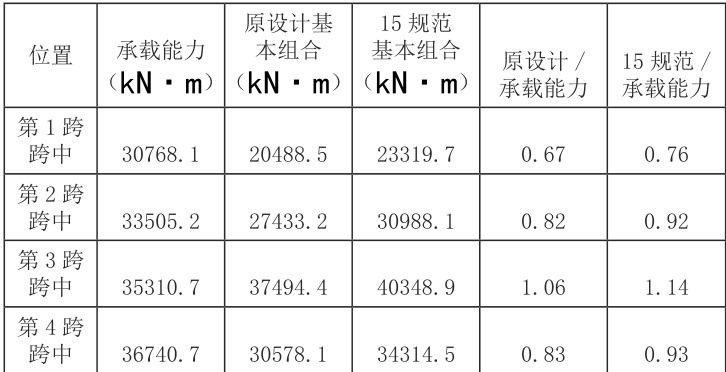 从计算结果表 1 可知,第 3 跨跨中原设计基本组合效应和 15 规范组合效应均大于承载能力,说明第 3 跨正截面抗弯承载能力不满足原设计要求,也不满足15 规范要求,其余跨正截面强度均满足原设计和15 规范要求。