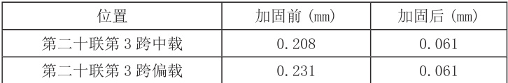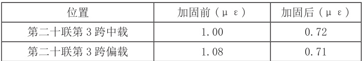 为检验加固效果,将结构前后静载试验结果进行对比,结果见表 2~ 表 4,试验结果表明第二十联第 3 跨应变校验系数从加固前的 1.00~1. .08 变为加固后的
