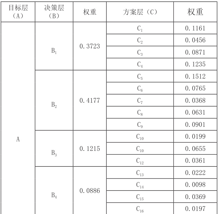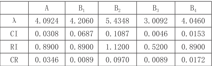 (6)矩阵的一致性检验。对矩阵计算结果进行一致性检验,定义一致性指标,式中,为矩阵特征值,为矩阵维度同时为衡量CI 的大小,在检验判断矩阵是否具有一致性时,还需将CI 和随机一致性指标RI 比较。得出检验系数。计算以上各数值填入表3.8 中。所有矩阵CR 值均小于0.1。说明所有的矩阵赋值合理权重可靠。
