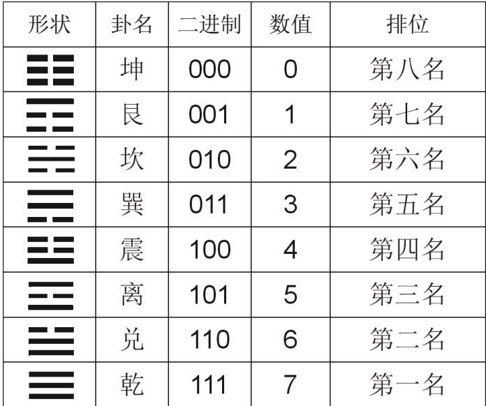 古人很聪明,用“— —”表示无即是0,用“ ”表示有即是1,这两个符号叫做爻也称卦爻、爻签,中间有缺口的叫阴爻,中间无缺口的叫阳爻。太阳照在人身上是热的为阳,月亮照在人身上是冷的为阴,这就是古人最初认知的阴阳,故月亮也叫太阴。用阴爻和阳爻的不同排列组合从下往上摆放来记数,读数要从下往上读。在古代,找有长有短的条状物是很容易的,当时没有纸笔墨也写不了,所以从下往上摆放这些爻签就可以简单记数了。现代人到寺庙摇签问卦,实际是“爻签占卦”,摇一摇或者抛一抛,随机展现的是那一条爻,或占据的是哪一个卦所在的位置方位。例如,摆放“三条阴爻”记为 000 即无为 0,命名叫坤卦;从下往上摆“二条阴爻和一条阳爻”记为001 即是1,命名叫艮卦,以此类推,如表1 所示: