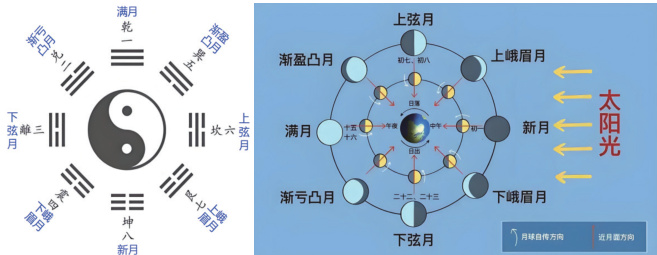 古人在观察月亮时发现其有周期性圆缺,八卦表中乾卦是最大数,为第一名,最满,为至光至亮至圆时表示月圆,乾卦放在最顶上,就是满月十五;坤卦是最小数 0,为第八名,几乎看不到月亮,就是新月初一,坤卦放在对应的最下方,其它按八卦方位一一对应放置,就得出如图6 所示,再与现在的月相图如图7 对比,是一样的: