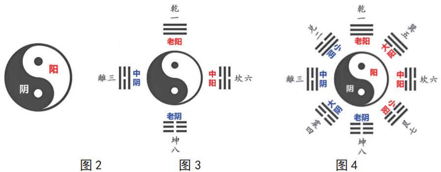古人用简易的实物创造了两个记数符号阴爻和阳爻,0 和 1 就是最极端的两个数被称为太极,故有太极生两仪(鱼),如图 2 所示。把至阳的乾卦放在最上端,称之为老阳(也称太阳,但与现在的太阳名字混淆);把至阴的坤卦放在对应的最下端,称之为老阴(也称太阴);在表 1 中,可以看出离卦和坎卦是刚好居中对称的,在图3 的中间两侧刚好是阴阳对半分,在表 1 中可看出,离卦的中间是一条阴爻,为中阴之意,放在阴渐多的左侧中间;坎卦的中间是一条阳爻,为中阳之意,放在阳渐多的右侧中间;这样就形成了四个方位,称为四象,(此文四个象位的名称可能与古籍不一样,但取其意思即可),这就是两仪(鱼)生四象,如图 3 所示。在四个象位之间再按顺序把其余四个卦放进去,就有了四象生八卦,象即是向,方向方位之意,就有了八个方向方位,古人的方位表达在不同的历史时期与现在相比有相同的也有不同的,不能一概而论。成语“四面八方”即与此有关,如图 4 所示。“太极生两仪、两仪生四象、四象生八卦”,一阴一阳本质就是 0+1=1 ,1 变 2,2 变 4,4 变 8,8 变64,……,无穷无尽的指数式增长,暗含核子裂变、细胞裂变原理。