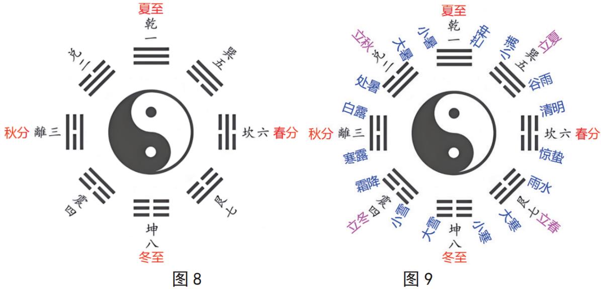 随着生产力的提升,社会的进步,仅有以上四个节气,时间跨度太大,对于指导生产生活意义不大,所以进一步的观察太阳和根据农耕经验就继续地细分下去,因为八卦图是由24 条爻组成的,故设了24 个节气,如图9 所示。