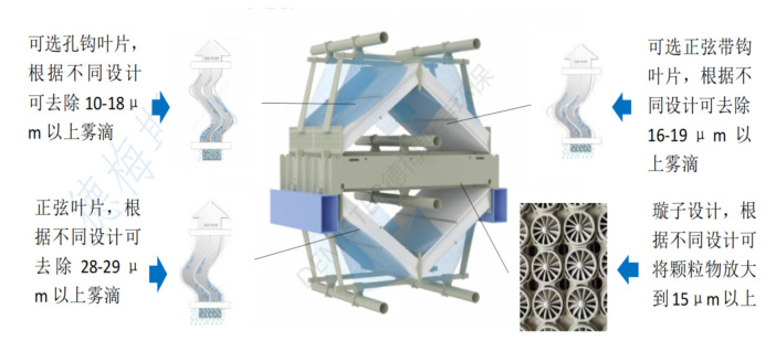一级倒屋脊粗除雾器:30mm间距正弦叶片(图2),拦截>22μm液滴,出口雾滴≤150mg/m³;