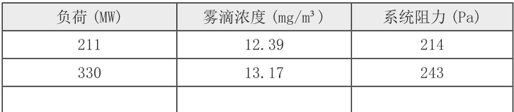 雾滴浓度:在211MW负荷下为12.39mg/m³,330MW负荷下为13.17mg/m³,均稳定≤15mg/m³(低于设计保证值)。
