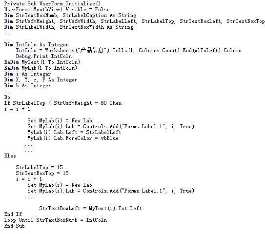 采用 VBA 代码实现图形化操作界面的自动生成。如图 4 所示,在代码编写界面只需建立一窗体以及若干个控件就能搭建出操作界面基本框架。依靠 VBA代码即可根据结构表内容,自动在用户窗体上投放文本框和内容。当结构表发生改变时,操作界面随动改变。图5 展示了实现该功能的部分代码。