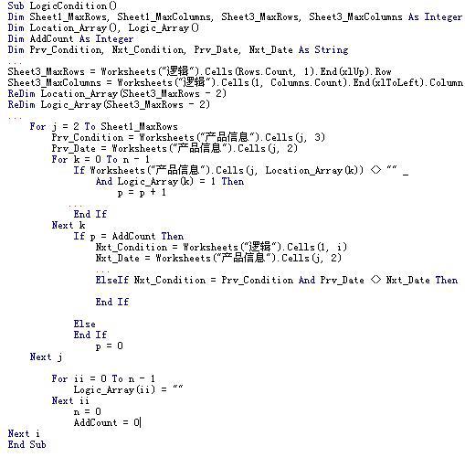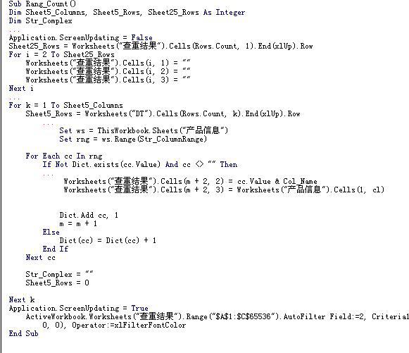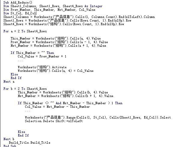 大量数据组成的结构化数据表,实质上是一类多维数组。在这样的数据结构中,查找不同名称的配套部件是否存在重复值是非常困难的。因此在算法上使用了“降维”的概念,在庞大的数据表中提取相应配套件的数据信息与坐标位置,并在单独的表格中排列显示,再结合数据有效性的设定确定重复编号发生的产品名称和其对应的配套情况。通过 VBA 程序能够按不同配套产品所在的字段区域,自动定位查找重复值,并单独列表显示。图 7 展示了实现该功能的部分代码。