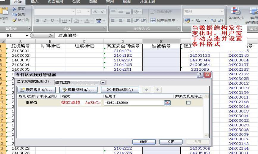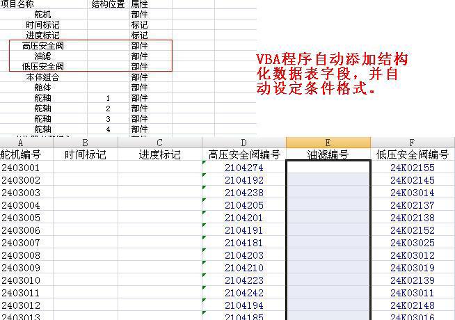 采用 VBA 方法自动搭建结构化数据表,当产品状态变化需要增加或减少字段时,只需调整结构表的内容,在重新在开 Excel 文件时便能自动生成和调整相应的数据结构。同时,VBA 程序能够根据结构表调整后的内容,自动对需要预防重复编号的区域位置重新设定数据有效性规则,如图 3 所示。该功能极大降低了操作的复杂性,提高了规则效率与准确性。