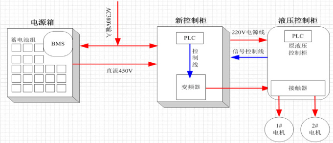 控制柜控制变频器的启停保护输入电源和工作电机、显示电机运行状态和电池等参数、控制变频器的交直流电源输入。