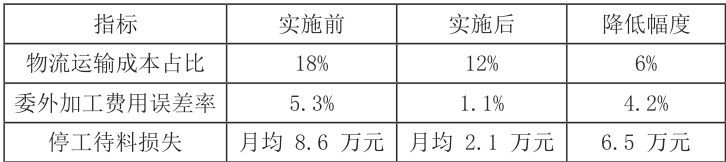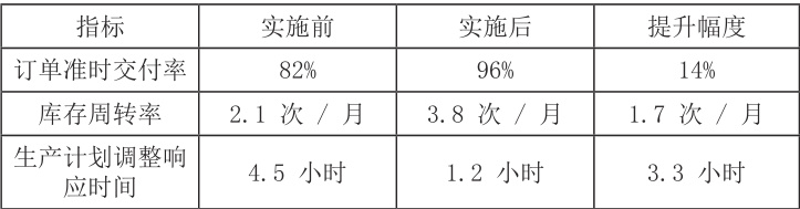 表 2 数据反映成本优化成效明显。物流运输成本占比下降 6%,因 MOM 通过 TMS 整合物流路径规划,降低单位运输成本;委外加工费用误差率从 5.3% 降至 1.1%,得益于 MOM 自动核算半成品费用、加工服务费及运费,减少人工核算偏差;停工待料损失月均减少 6.5万元,源于 MOM 对原材料库存的动态监控,避免产线闲置。