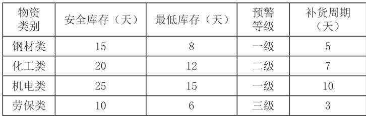 表1 矿用物资库存预警阈值设置表