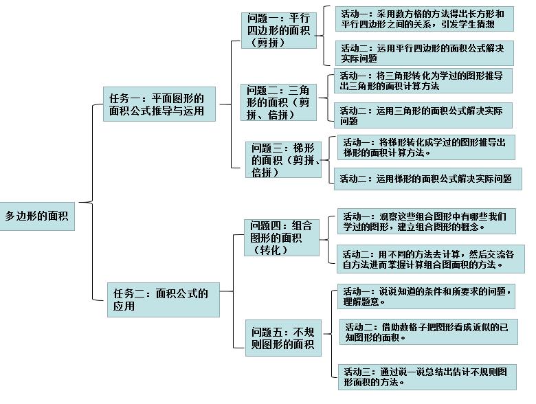 四边形的面行 四方方学生方和(剪拼) 活动二:运用平行四边形的面积公式解决实际问题活动一:将三角形转化为学过的图形推导问题二:三角 出三角形的面积计算方法一式面图 面剪 活动二:运用三角形的面积公式解决实际面:、 活动一转化成学过的图形推导出倍拼) 活动二:运用梯形的面积公式解决实际问题多边形的面积 问题四:组合 ,组合图形有些我们图形的面积(转化) 活动二:用不同的方法去计算,然后交流各自方法进而掌握计算组合图面积的方法。任务二:面积公式的 活动一:说说知道的条件和所要求的问题,应用 理解题意。问图五:积 活动三:借助数格子把图形看成近似的已活动三:通过说一说总结出估计不规则图形面积的方法。