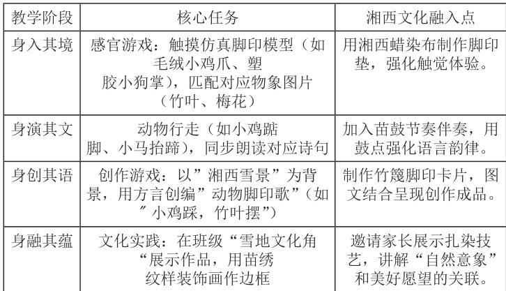 《雪地里的小画家》作为一年级上册诗歌,以 " 动物脚印—自然意象 " 的比喻链条为核心,其句式简短、意象鲜明的特点,为具身化转化提供了天然载体。文本中" 竹叶"" 梅花" 等意象可延伸至湘西竹编、苗绣纹样,实现" 文本符号—文化符号—身体符号" 的转译。