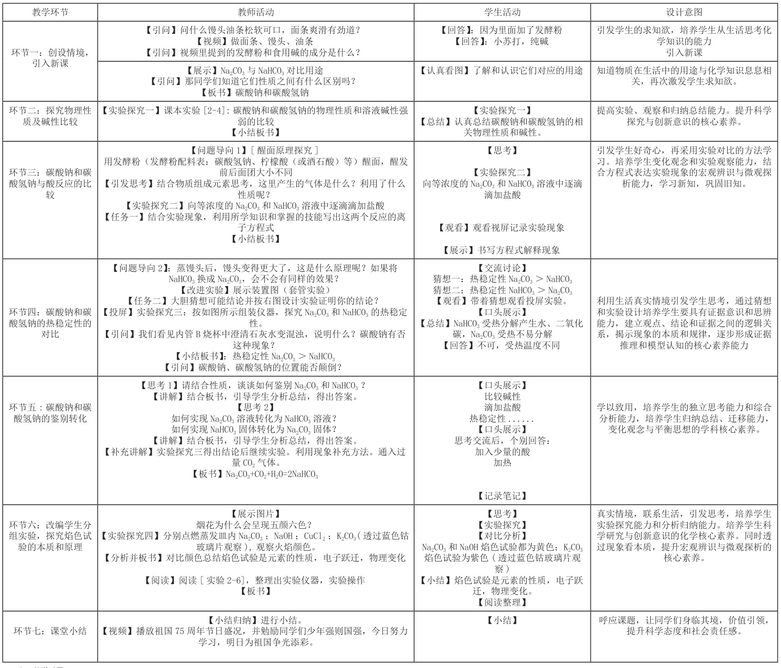 以“面条、馒头、油条的制作”创设情境,引入新课。以物质在生活中的用途对比,导出学习方法。再紧扣情境设计问题导向,进行对比实验,培养学生的实验能力、观察能力和归纳总结能力,提升科学探究与创新意识的核心素养,结合方程式表达实验现象的宏观辨识与微观探析能力 , 建立观点、结论和证据之间的逻辑关系,揭示现象的本质和规律,逐步形成证据推理和模型认知的核心素养能力。焰色试验直观验证“元素共性”,培养宏观辨识与微观探析的核心素养。节日盛况,呼应课题,价值引领,提升学生的科学态度和社会责任感。