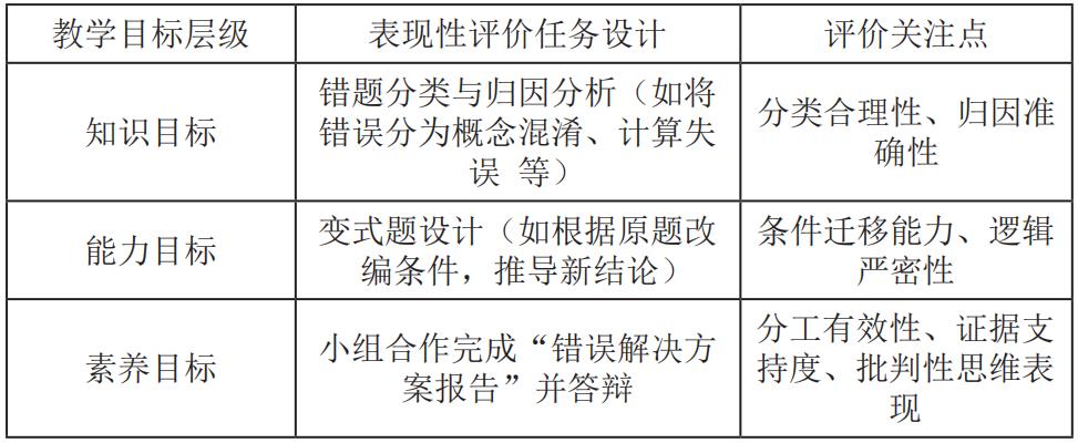 (3)促进深度学习发生:通过小组合作设计错题改编题等表现性任务,推动学生从解题者向命题者转化,强化对知识逻辑的理解。合作与互动是迁移应用能力真正的表现性评价最高的体现,也是实现教学目标最有效的方法。