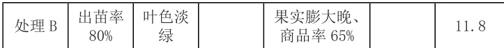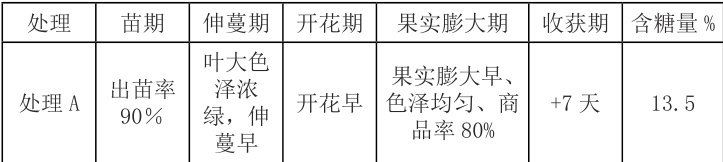 4.1在哈密瓜上施用“施地佳”,对各生育时期的生物学性状有较大改善。其中哈密瓜的出苗率,肥料处理较对照提高了10%;产品的商品率提高了15%,成熟期提早7天,含糖量提高了1.7%。