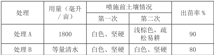 4.2、施用方法:处理A,苗期将本品定量加入喷雾器中稀释后均匀喷于地表,然后灌水,共2 次,每小区用量为130 毫升(1800 毫升/ 亩);处理B 为对照,只喷等量的清水,其他措施相同。每次试验前取土分析。