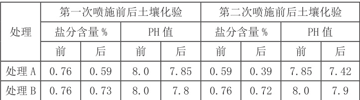 试验地属中度盐碱,经过一个生长季土壤盐分含量都有所下降。处理 A 盐分下降幅度最大,由试验前的 0.76% 降到 0.39% ,下降了 49% ,基本消防了盐碱的危害;处理B 盐分降到了 0.72% ,下降 0.04% ,仍处于中度盐碱。