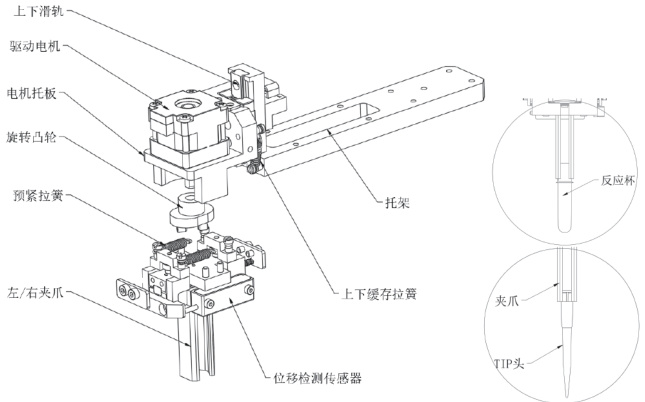 生化类与化学发光类设备作为临床检验“主力机型”,日均处理样本量达数百至数千份,需高频次处理 TIP 头(移液吸头)与反应杯(反应载体)。二者耗材特性差异显著:生化设备反应杯多为玻璃/ 硬质塑料材质且可重复使用(清洗复用),无需独立转移机构;化学发光设备反应杯因需兼容化学发光底物(清洁度、密封性要求高),且 TIP 头直接接触样本 / 试剂(防交叉污染),两类耗材均需一次性单独转移。主流方案采用“凸轮驱动 + 模块化集成”机械抓取机构,通过凸轮结构实现夹爪开合,适配 5.5-12.0mm 外径的 TIP 头及 96 孔板配套反应杯(兼容90% 市售规格),集成于机械臂末端,配合导轨与传感器,抓取容差±2mm,支持每秒 2-3 次高速抓取,确保耗材在加样位、孵育位、检测位间的高效转移。驱动系统选用步进电机配合同步带传动(传动效率>90%,)电机扭矩反馈可避免耗材损伤。当前向“高兼容、高可靠”优化,如柔性凸轮降低破损率,压力传感器实现自适应夹紧。