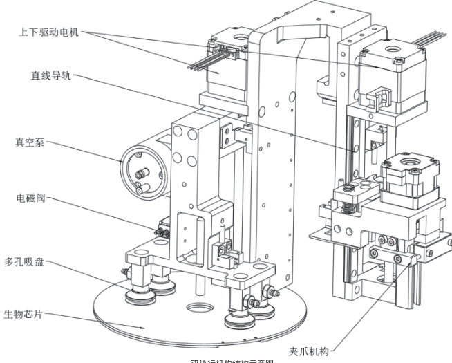 单分子检测对耗材集成化、精密化要求高,需兼顾 TIP 头、反应杯及微流控芯片的转移。采用双执行机构设计:一侧执行机械抓取常规耗材(TIP 头和反应杯),对称侧执行芯片吸附,真空泵提供负压(- 5 kPa 至 - 50 kPa 负压),电磁阀控制压力方向,通过多孔吸盘实现芯片柔性吸附,结合柔性压力控制(接触应力≤ 0.1 N/mm²),可通过调节吸盘布局形态,兼容市面上 50mm×50mm 至 120mm×120mm生物芯片的转移;双机构协同工作,实现三类耗材的高效无损转移,成本较常规的独立机构降低 50%, 实现连续 8 小时运行稳定性达99.9%。