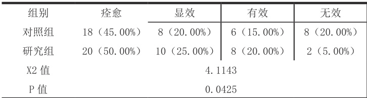 研究组患者治疗总有效率为 95.00% 高于对照组 80.00% , X2 值为 4.1143,P 值0.0425,差异显著,详情见表1。