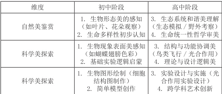 自然美鉴赏方面,以生物形态美的直观感知为起点,逐步进阶到生态系统和谐美的理解,最终到生命多样性与统一性的哲学审美;科学美探索方面,从生物现象的表面美入手,深入到生物结构与功能的协调美,最终实现科学理论与实验设计的逻辑美;艺术美创造方面,从生物图形的绘制、生物模型的制作到生物实验的设计,最终实现跨学科的艺术创新。