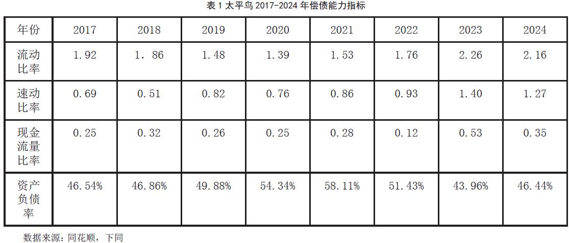 在偿债能力评估中,本文选取流动比率、速动比率及现金流量比率三项指标,以综合反映太平鸟短期偿付能力与现金保障水平。考虑到资产负债率将经营负债与金融负债合并计算,易掩盖企业真实的刚性偿债压力,本文不再将其纳入核心观测。相较之下,上述三项流动性指标更能直接揭示转型前后短期偿债能力的真实变化,因此下文将以此为基础展开分析。