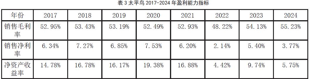 2017—2024年期间,太平鸟净利润增长率波动明显。2017—2018年,公司净利润实现正向增长,2018年净利润增长率达到27.51%,这主要得益于太平鸟运用数字化技术强化商品和供应链管理,推进供应链快反,有效提升商品售罄率,数字化改革初具成效。2019年,公司调整零售渠道,关闭加盟店并拓展直营门店,同时加大品牌营销投入,导致净利润同比下降。2020年,公司采用大数据选址并拓展社交新零售渠道,净利润增长率高达29.24%。然而,2021—2022年受外部环境影响,净利润增长率有所下降,2022年净利润增长率大幅下滑至-72.56%,主要由于疫情反复导致线下客流锐减,同时公司为应对市场变化关闭大量低效门店,线上渠道竞争加剧导致顾客流失,线上零售收入大幅度下滑。2023—2024年,净利润增长率继续波动,2023年短暂回升至127.06%,但2024年再次下滑至-38.75%,这表明公司在转型过程中仍面临客群流失与市场吸引力下降的问题。