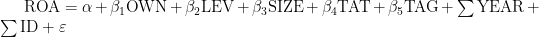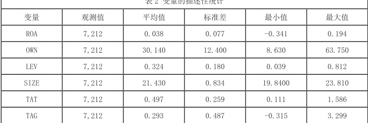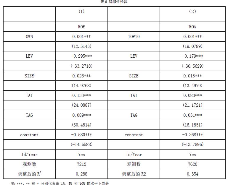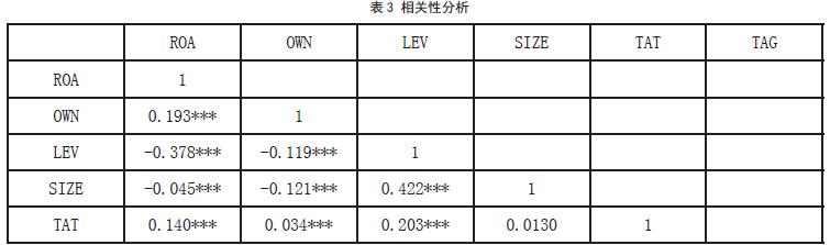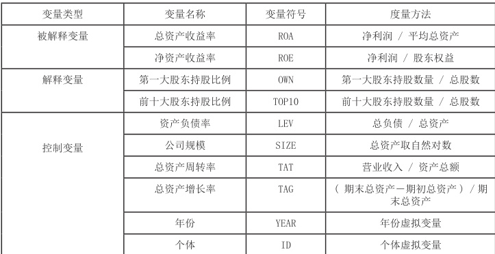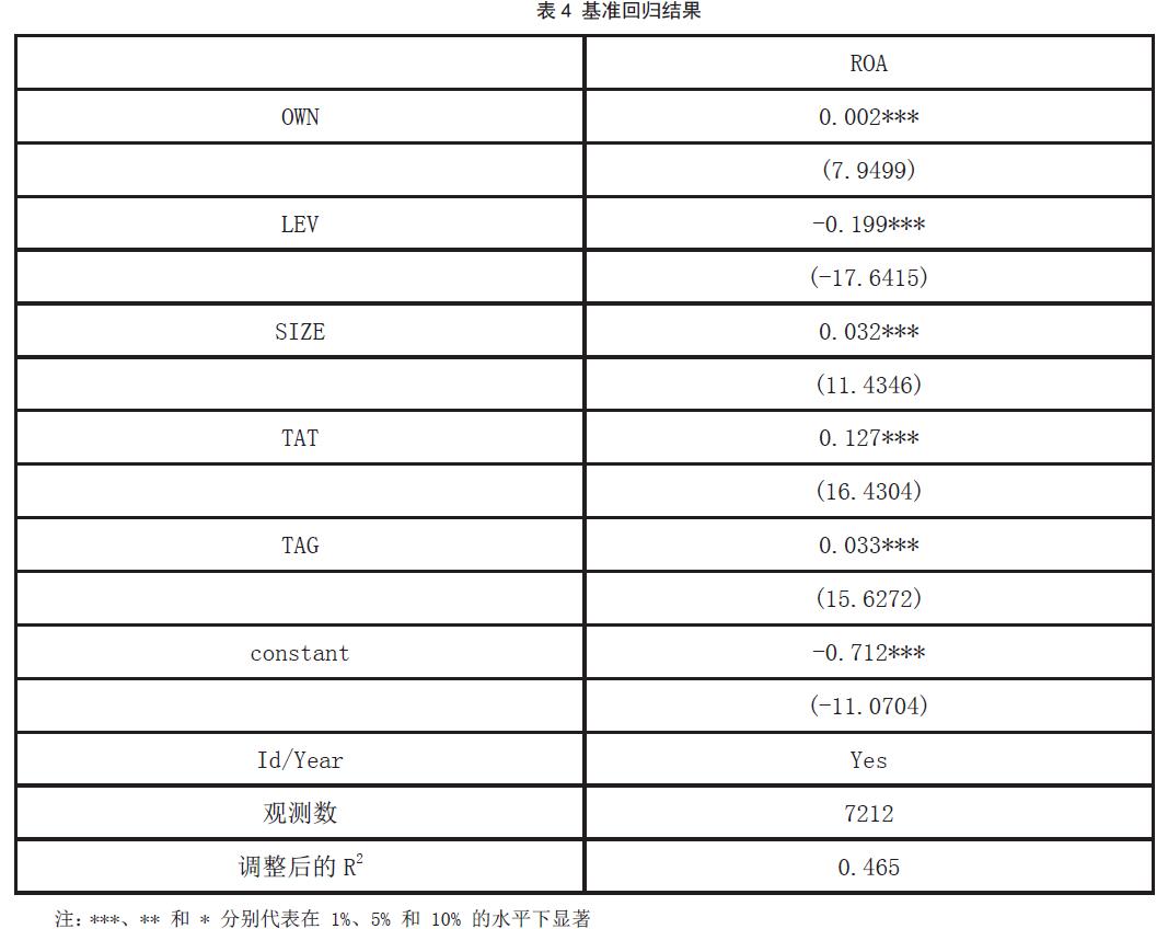 其中,ROA 为总资产收益率,OWN 为第一大股东持股比例,LEV 为资产负债率,SIZE 为公司规模,TAT 为总资产周转率,TAG 为总资产增长率,YEAR 为时间固定效应,ID 为个体固定效应。 α,*### , β1 β2 β3 β4 为模型的回归系数,