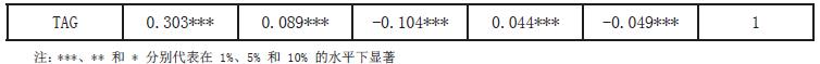 (3) 控制变量。针对研究,本文选取四个控制变量:资产负债率(LEV)、公司规模(SIZE)、总资产周转率(TAT)、总资产增长率(TAG)控制了时间和个体效应的影响。具体变量定义如下表1 所示。