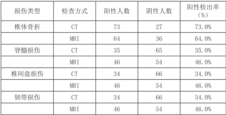 (1)椎体骨折:CT 检查结果显示,阳性人数为 73 人,阴性人数为 27 人;MRI 检查结果显示,阳性人数为 64 人,阴性人数为 36 人。(2)脊髓损伤:CT检查结果显示,阳性人数为 35 人,阴性人数为 65 人;MRI 检查结果显示,阳性人数为 46 人,阴性人数为 54 人。(3)椎间盘损伤:CT 检查结果显示,阳性人数为 34 人,阴性人数为 66 人;MRI 检查结果显示,阳性人数为 46 人,阴性人数为 54 人。(4)韧带损伤:CT 检查结果显示,阳性人数为 34 人,阴性人数为66 人;MRI 检查结果显示,阳性人数为46 人,阴性人数为54 人。