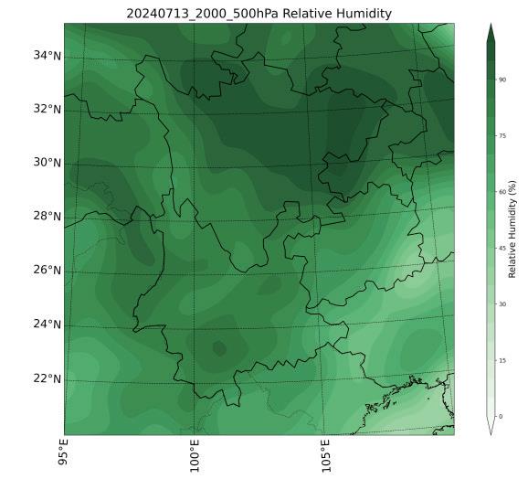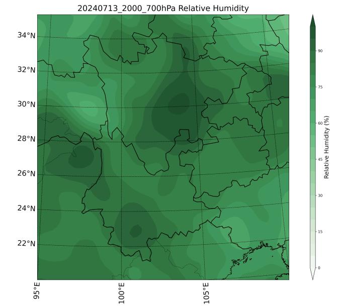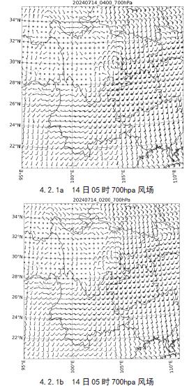 4.5 水汽条件关键指标。水汽因子是影响盐津县短时强降水的关键因素,该区域的水汽主要来自偏南气流(西南气流、南风、东南气流)。由图可见(图 4.5a 4.5b), 湿层比较深厚。盐津短时强降水生前 700hpa 相对湿度 90% 以上,相对湿度在天气系统控制条件下, 在日常预报工作中基于 MICAPS 中 700hpa 相对湿度达 90%以上出现的时刻为短时强降水开始时间,为短时强降雨定时预报提供参考。