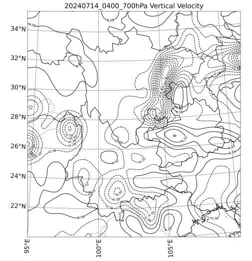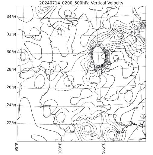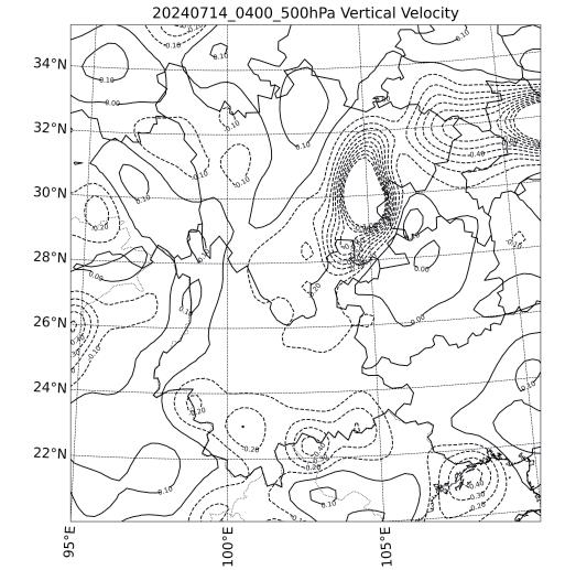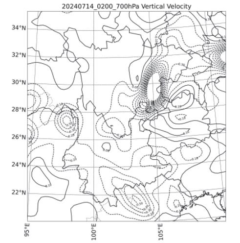 垂直速度。大气中水汽的凝结以及强降水过程的发生与大气的上升运动密切相关,垂直运动能引起水汽、能量、热量的垂直输送,它的强弱对天气系统的发生发展及降水量的强度都有很大的关系。14 日 02 时从700hpa 至 500hpa 垂直速度场分析,由低层到高层垂直动力比较深厚,动力值由低层向高层增加,动力中心位于盐津东北部,如图(4.4a、4.4b、4.4c、4.4d)存在 0.5 至 1. 0pa/s 的动力垂直速度中心;04 时中心的垂直速度一直维持在盐津附近;强烈的上升运动为水汽的凝结和强降水的产生提供了动力条件。从低层到高层的动力厚度为降雨量评估提供科学决策,经多次降水量出现的表明:某次天气过程出现的最大降雨量与动力值之间存在着一定关系,为短时强降雨的极大值量级预报提供较强指示性。