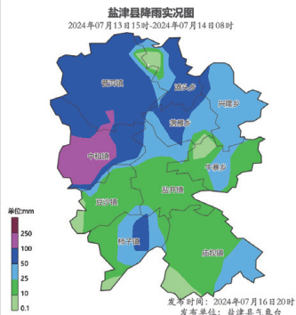 7 月 13 日 15 时至 14 日 08 时,盐津县普降大到暴雨,局部大暴雨,其中大暴雨 3 站,暴雨 10 站,大雨 9站;最大降雨量出现在中和中堡(163.2mm), 最大小时雨强达50.5mm(中和站)。具体分布图如下: