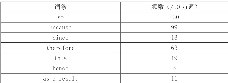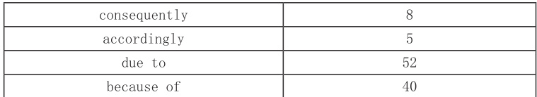 为了进一步探究校本语料库的其它语言特征,我们对因果连接词的使用进行了检索与对比。检索词条包括 so,because, inc due to, because of,thus 等。这里需要说明的是 能表达因果关系,但本次检索的主要目的是考 ue to,我们只记录其做原因状语的使用情 o that, as to 连用表达其它意思, 会对检索结果逐条验证,排除不符合要求的 句法功能类似,因此在检索结果中不加区 对频数呈现。结果如下表所示: