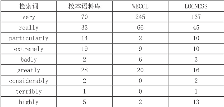 除了因果连接词,我们还对一些程度副词进行了简单的检索与对比。检索方法仍然是获取频数后进行标准化处理,以每10 万词形式呈现。同时我们还检索了WECCL 及LOCNESS 的对应词条以进行对比。