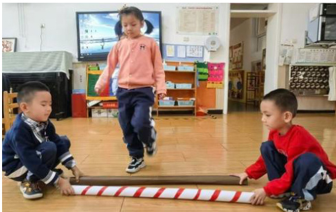 园长妈妈看到孩子们自主探索、认真专注的样子,也为我们助力,一起寻找最合适地材料。当真正的竹竿出现时,他们激动不已。跟着音乐首先进行单人跳游戏,开始时,并没有想象中那样顺利。双方的配合度不高。打竹竿的两个小伙伴,速度不一致,导致跳竹竿的小朋友被卡到了脚;有时是跳竹竿的孩子节奏快慢出差错,导致打竹竿的节奏失误。面对这样的问题,我们共同探讨解决方法。
