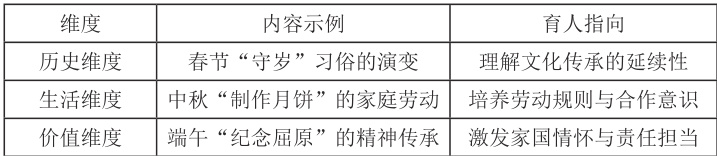 以 2022 版新课标为依据,将传统节日内容与“我们的节假日”“家乡的喜和忧”“骄人祖先 灿烂文化”等主题单元有机融合,构建“历史维度——生活维度——价值维度”的三维内容体系(见表1)。
