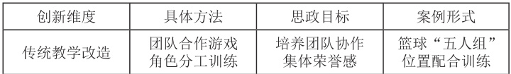 传统体育教学改革:课程思政视域下,体育专业教师需注重教学方法和载体的设计。如,采取案例法、演示法、任务驱动法等师生互动的教学方式,采取角色扮演、模拟和游戏、练习法、实践强化法等生动有趣的教学方法;教师应注重教学改革,设计融合思政元素的课堂活动,以满足学生“技能+ 品质”的塑造。如,为增强学生的训练效果、责任感和集体荣誉感,在沙滩排球教学中设计“绑腿前进”活动;为培养学生的传球技能、合作精神和团队意识,在橄榄球教学中组织“团队连续传球挑战”游戏等。教师可采用线上 + 线下混合方式提升教学实效,突破时空限制。如,淮安体校先后为国家培养输送了 2 名奥运冠军、9 名世界冠军、17 名亚洲冠军和多名全国冠军等,邀请他们录制视频或现场开展讲座、介绍经验、教授技巧、传递正能量。课程思政不是简单的在课程中加入思政条目,而是“你中有我,我中有你”的融合,这些活动将抽象的思政理念转化为具象的体育实践,使学生在身心体验中内化价值观念。