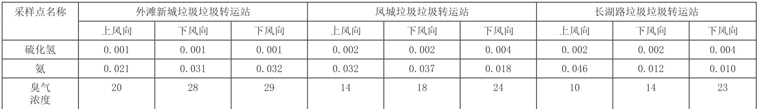 本文是严格遵循生活垃圾转运站运行维护技术标准来进行,在垃圾中转站站站区上风向布置 1 个采样点,下风向布置 2 个采样点,主要检测项目为臭气浓度、氨、硫化氢等,采样时间通常确定在早上 8 点到中午 11 点间,每个样品采集时间为一小时,一共采集两个小时,将所有检测结果集中起来取平均值[2]。由于这段时间是整个垃圾垃圾转运站运行高峰期,运输垃圾数量和频率最高,同样是工作人员工作负担最大的时间,要合理利用这段时间。检测结果如表1 所示。