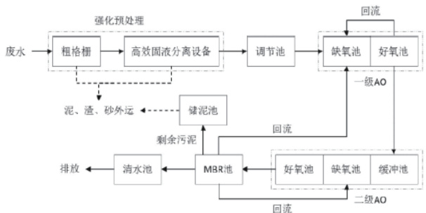 两级 AO+MBR 工艺流程操作简便,有良好的抗冲击负荷能力,在具体操作中占据的空间面积较小,最终的出水效果良好,是污水处理工作中的常用工艺。在整个工艺操作过程中,膜系统的泥水分离效果良好,能够独立分开水力停留时间(英文简称 HRT)和污泥停留时间(英文简称 HRT),其生化系统的污泥浓度较高,去污效果良好。