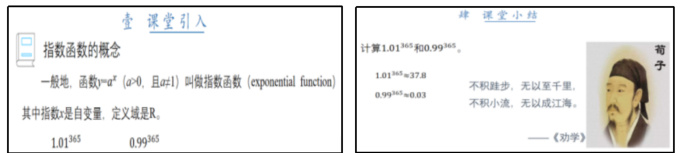 在课堂小结时, 学生们一般处于相对疲劳的的状态, 对教师所讲内容很难维持饱满的热情, 因此, 教师在选取课堂小结内容的呈现方式时还应当考虑到课堂的趣味性 [11]. 像图 5 中这首朗朗上口的打油诗 , 既能帮助学生理解记忆指数函数的知识点, 又以一种新颖有趣的方式调节了学生的疲劳 , 保持了学生的学习兴趣.