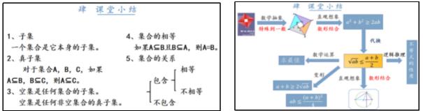 提纲挈领式课堂小结是指教师在课堂教学结束阶段, 通过准确简练的语言, 把本节课所授知识内容作全貌式的纲要性总结 . 它可以选择直接呈现本节课所授知识的纲要性总结, 也可以以图文结合的形式来总结本节课所授知识. 例如, 在《集合的基本关系》的课堂小结中, 通过对知识点的纲要性总结向学生展示本节课所学内容, 在教师总结的同时, 引导学生回忆本节课学习此知识点时的相关情形, 巩固所学知识; 再如, 在《基本不等式》的课堂小结中, 教师可以让学生尝试用简练的语言概括本节课的学习过程和所授知识, 潜移默化间培养学生的语言概括能力和语言表达能力. 我们分别以人教B 版普通高中数学必修第一册第一章第二节集合的基本关系和人教A 版普通高中数学必修第一册第二章第二节基本不等式为例, 来展示提纲挈领式课堂小结 ( 详见图 6 和图 7).
