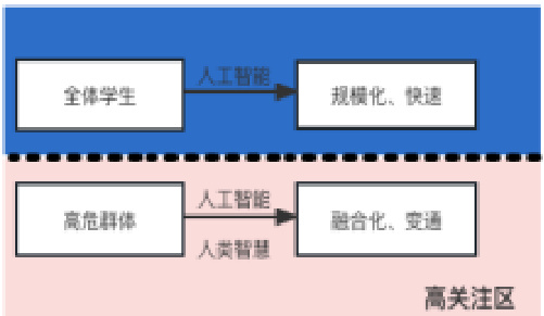 高关注区是指分析规则模糊,需经由隐性策略向显性策略的转化才能解决的实践困境,如心理危机高危群体。此区域需启动双通道学习,由机器先进行分析,主要依靠人类专家的高级共情能力和智慧进行最终研判,生成隐性、灵活、变通的心理调试策略,再与显性策略结合,共同指导学生成长。