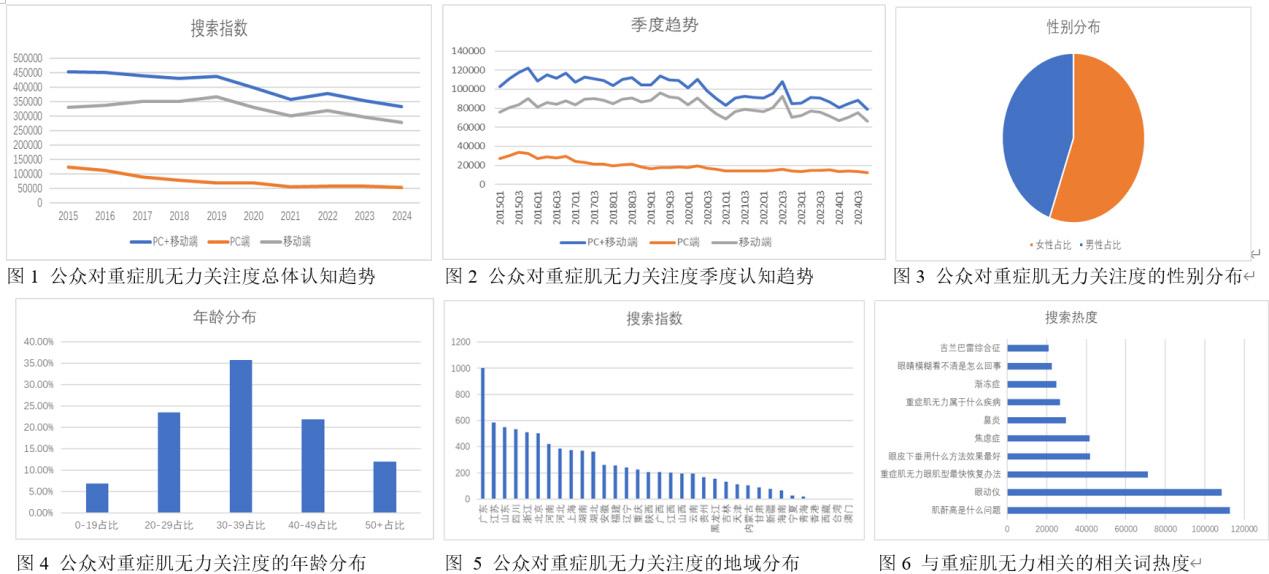2015-2024 年,公众对重症肌无力关注度持续下降,移动端为主要搜索渠道;30-39 岁女性及经济发达地区居民关注度较高,欠发达地区与老年群体认知不足;信息需求集中于症状应对,但存在疾病鉴别混淆与基础认知薄弱问题。
